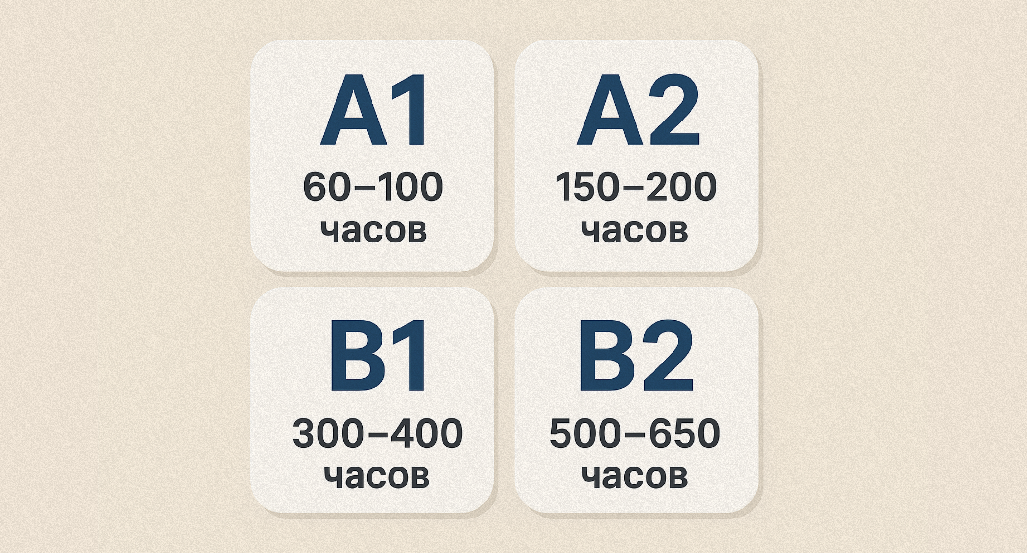 Согласно обзорным статьям, сроки таковы: A1 — 60-100 часов; A2 — 150-200; B1 — 300-400; B2 — 500-650 часов.